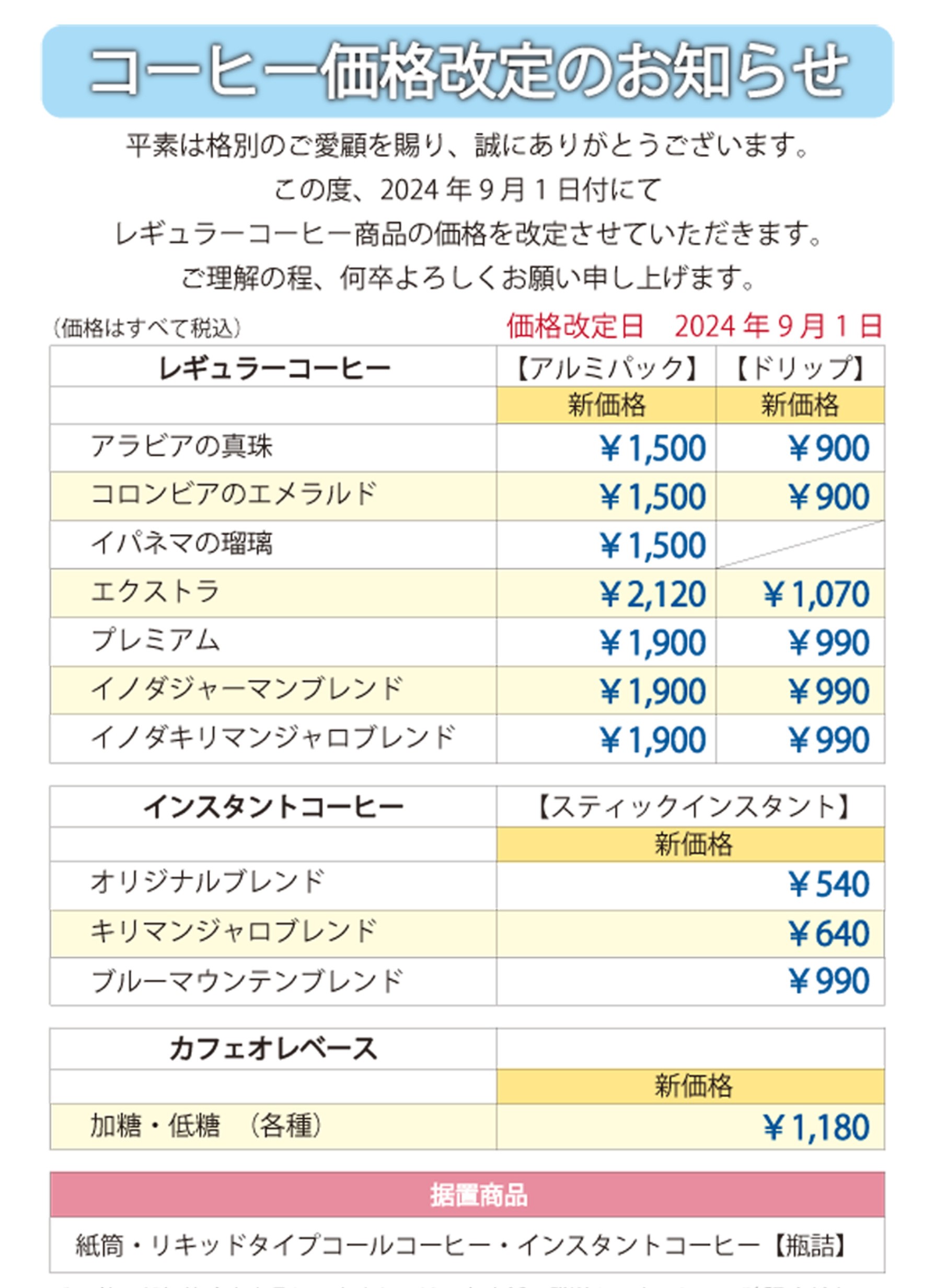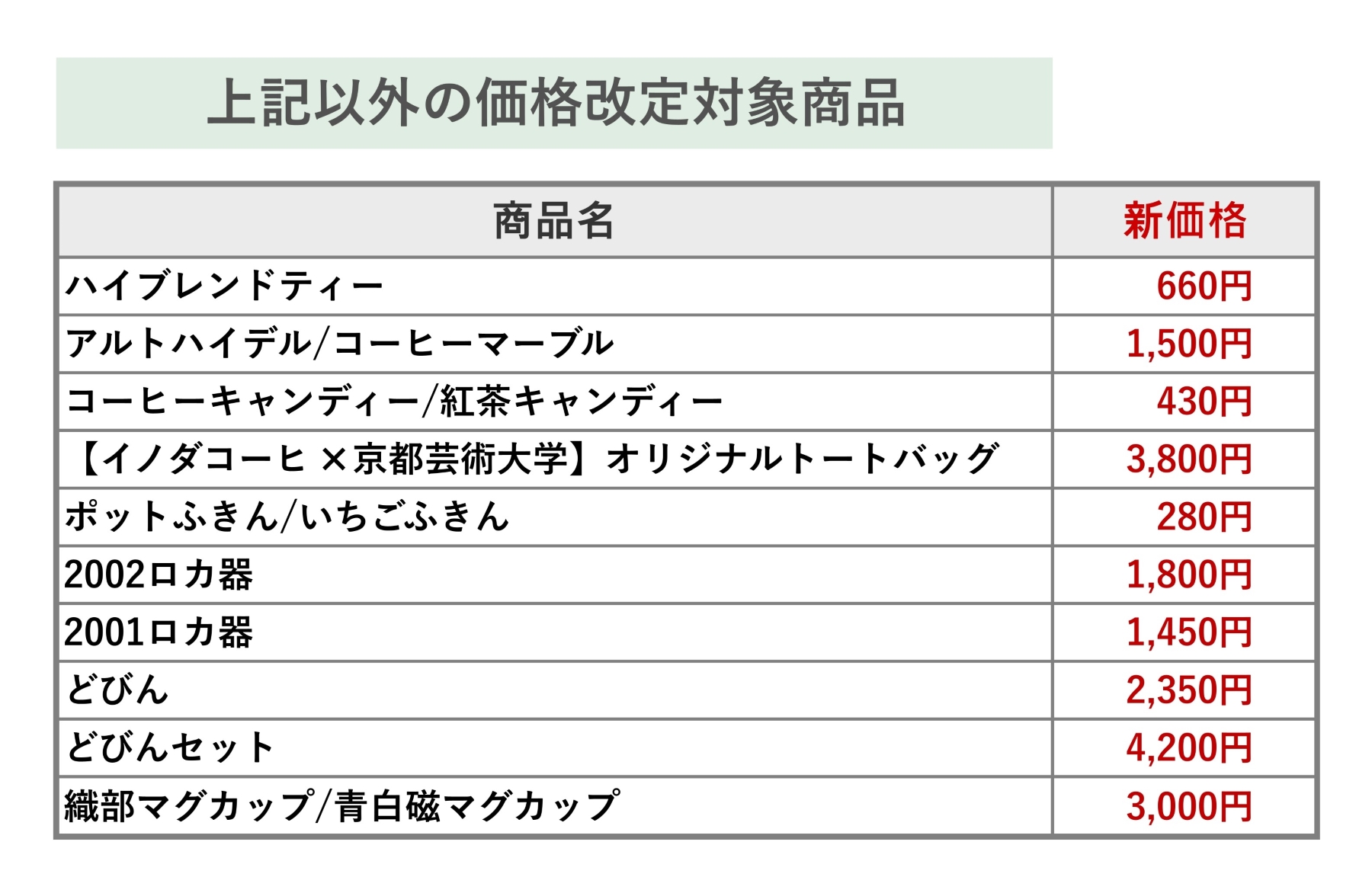 物販一部価格改定のお知らせ