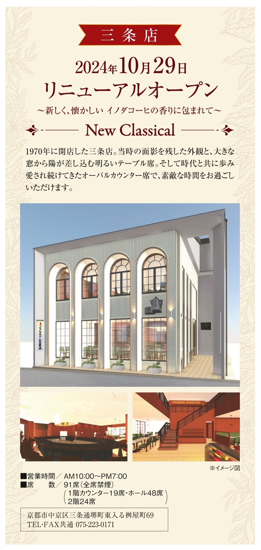 平素は格別のご愛顧を賜り、誠にありがとうございます。 さて、2022年から休業しておりました イノダコーヒ三条店 は 10月29日にリニューアルオープンする運びとなりました。