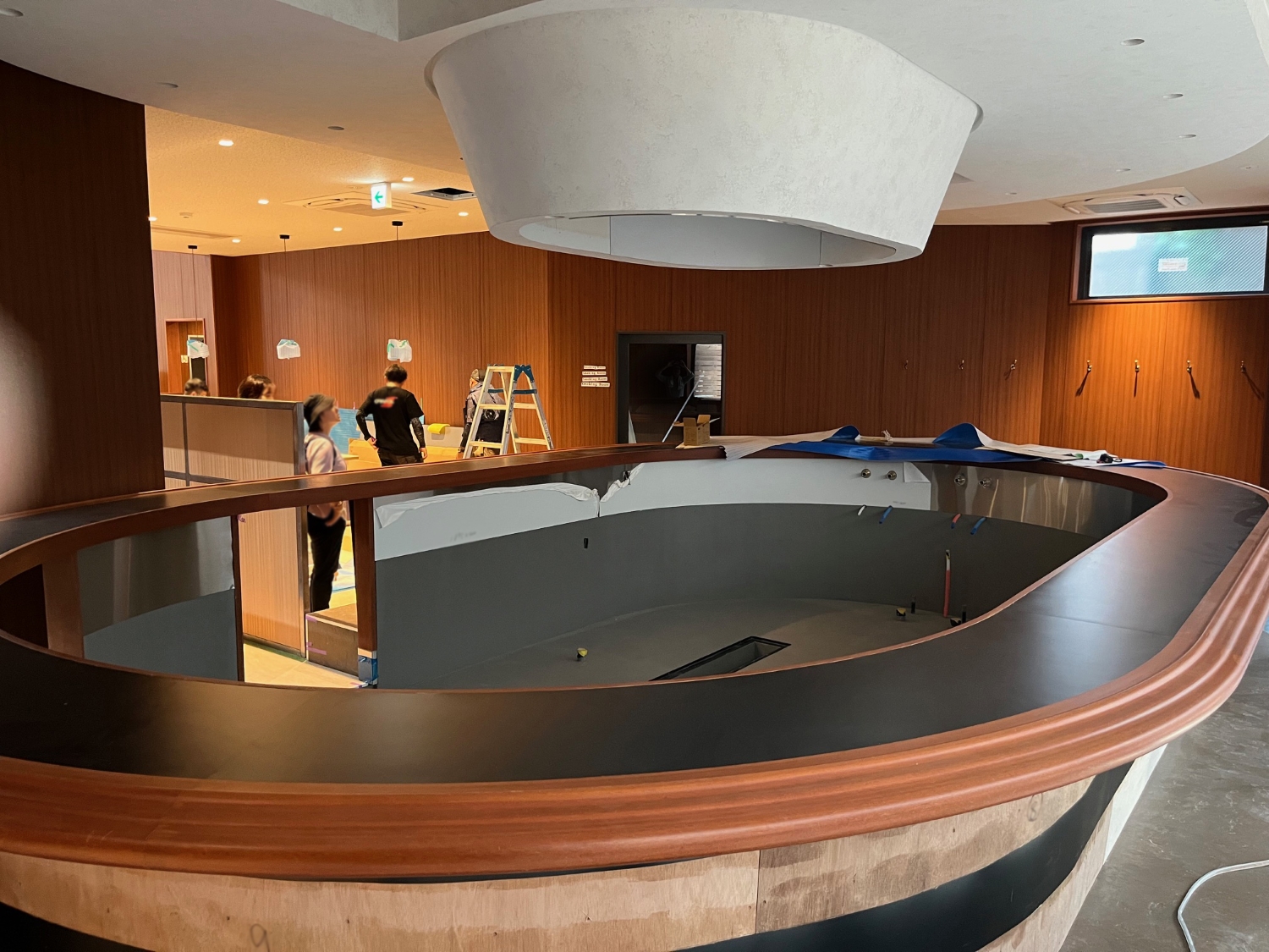 オーバルカウンターにコールドテーブルやガス台など新しい機器一式が設置されました。 カウンター形状にあわせ緻密に…