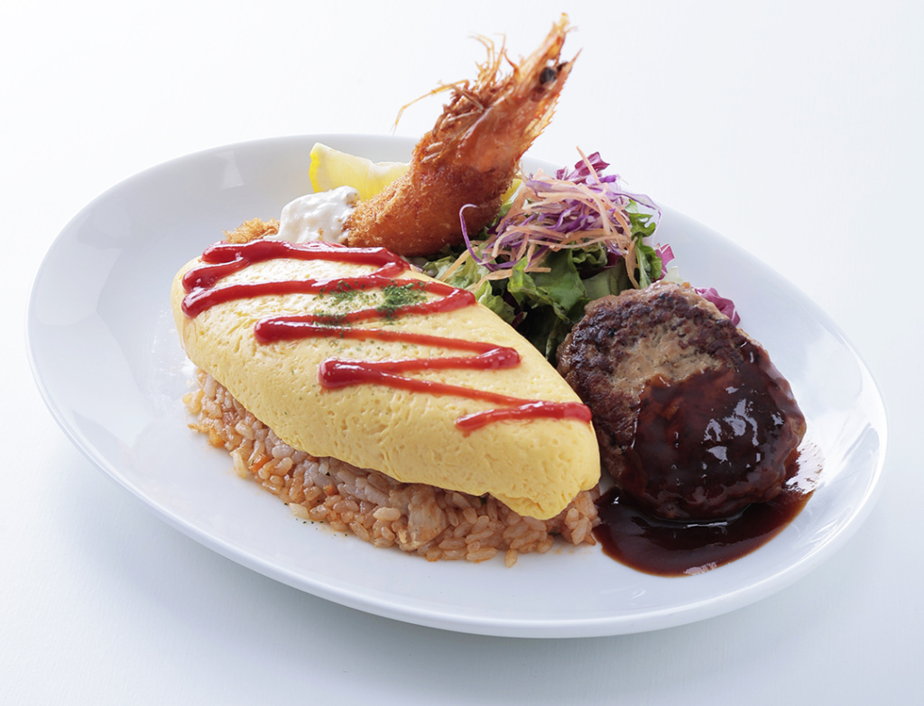 ふわとろ卵のオムライスに、サクッと香ばしい有頭エビフライ、ジューシーなミニハンバーグをひと皿に盛り合わせた、夢のようなワンプレート。見た目もボリュームも満点で、大人も子どもも笑顔になる贅沢メニューです。