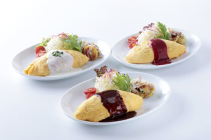 右上より時計回りに:A 昔ながらの赤いオムライス(トマトケチャップ) B 喫茶店仕立ての黒デミオムライス(デミグラスソース) C 白のご褒美ホワイトソースオムライス(ホワイトクリームソース)