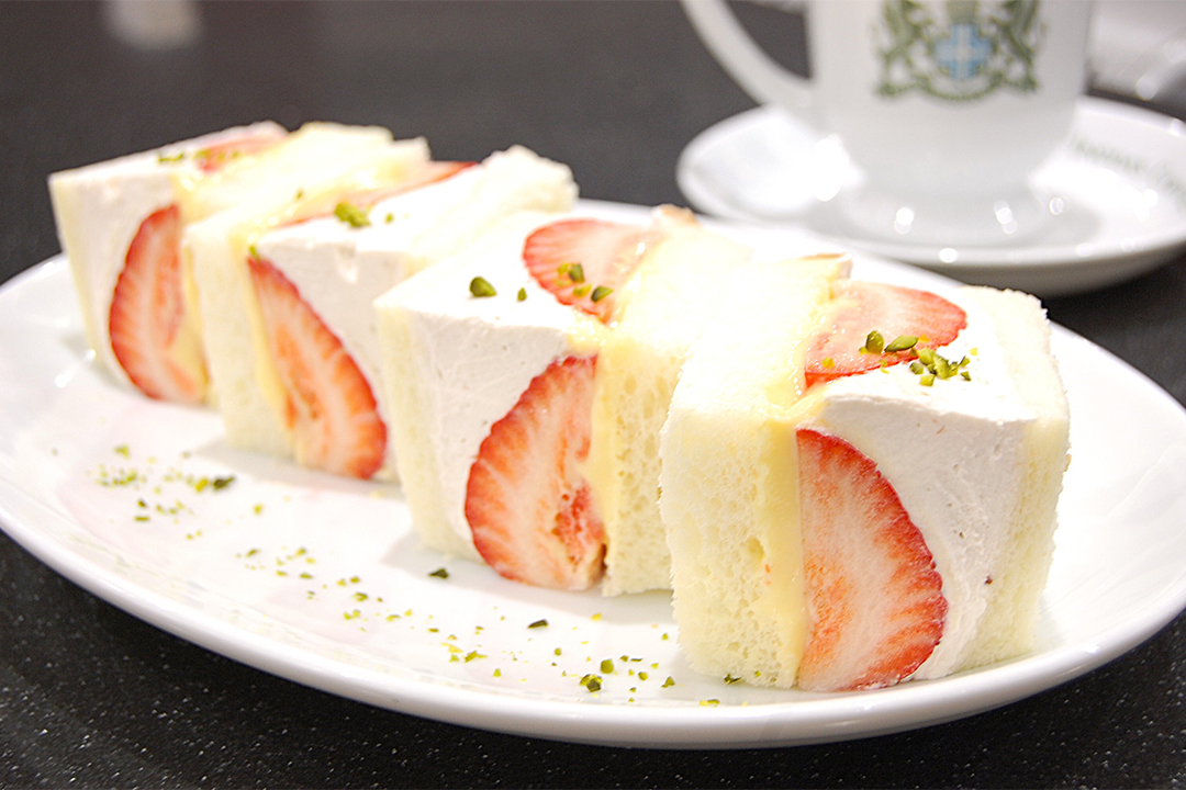 福岡県産苺「あまおう」を使用。イチゴジャムとキルシュを加えた生クリームに、甘さ控えめのカスタードクリームを合わせました。長時間発酵で仕上げたふわふわの食パンで包み込んだフルーツサンドです。